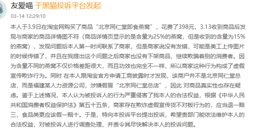 笔者发现,黑猫投诉平台上的数据同样令人担忧,截至12月15日,关于 同仁堂 产品的投诉量达254条,内容包括产品质量不符、成分标注不实等。其中有消费者投诉称,购买的祛痘产品实际含量与宣传不符;另有消费者发现,标注含有25%燕窝的产品实际含量仅为15%,而商家竟以“美工上传图片问题”为由搪塞。