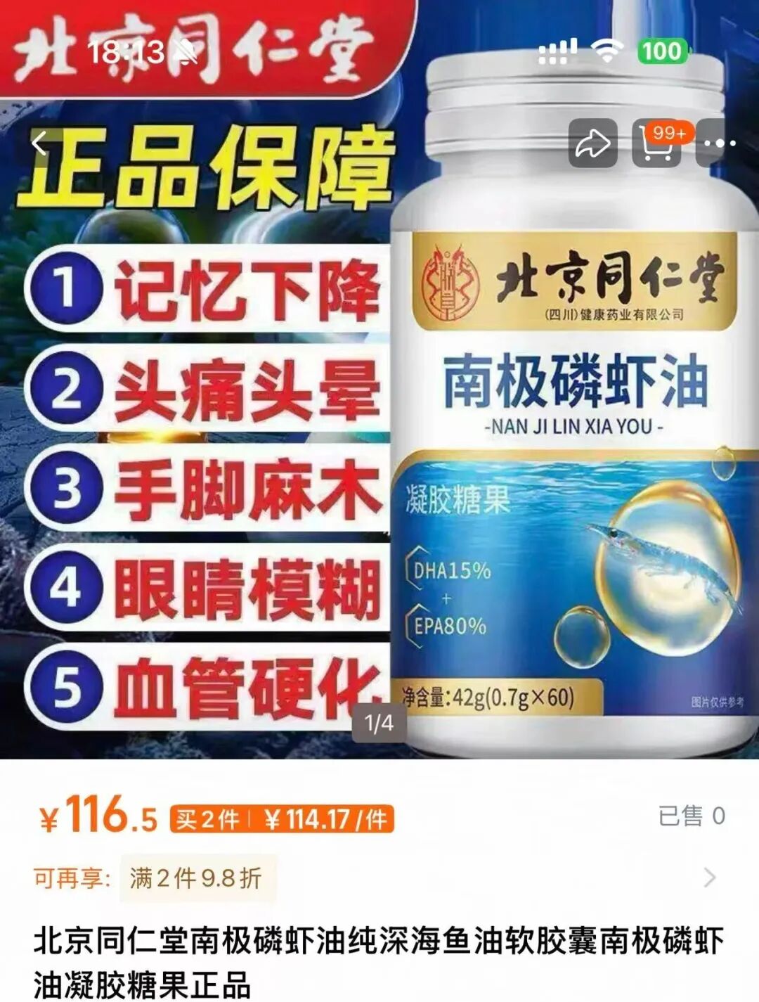 近日,一款标注为“北京同仁堂99%高纯南极磷虾油”的产品,经检测核心成分磷脂含量竟为0,让这家百年老字号陷入舆论漩涡。
