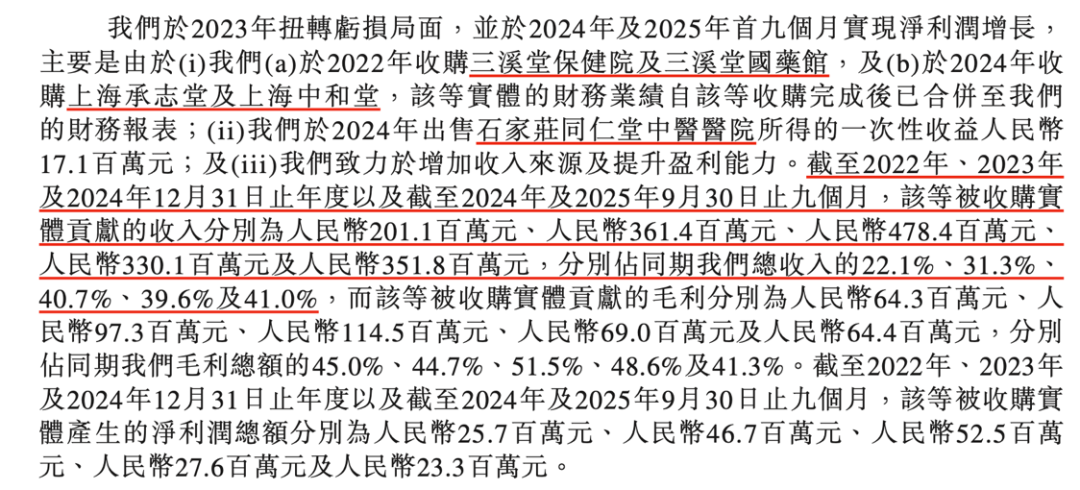 值得注意的是,同仁堂医养的增长高度依赖并购。招股书披露,2022-2024年期间,公司完成了超过10项收购交易,交易总额超过5亿元人民币。收购实体贡献的收入占比从2022年的22.1%上升至2024年的40.7%。