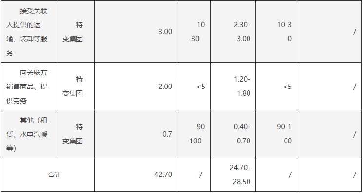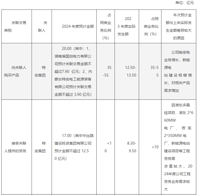 此外,资料还包含与新疆特变电工集团有限公司2024年度日常关联交易议案,其中明确,2024年度,拟向新疆特变电工集团有限公司及其分子公司(以下统称特变集团)采购或委托加工产品;接受特变集团提供的工程劳务、运输、装卸等服务;特变集团因生产经营需要,拟向公司采购变压器、线缆、开关柜、动力煤(含运输)、零星材料等产品,租赁公司部分厂房、机加工设备以及办公楼、员工宿舍等,接受公司提供的劳务服务,上述业务构成公司与特变集团的关联交易。详情如下: