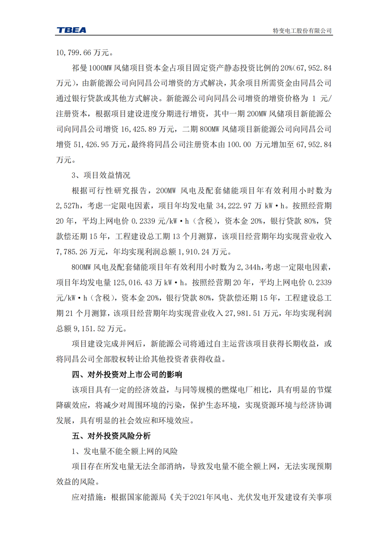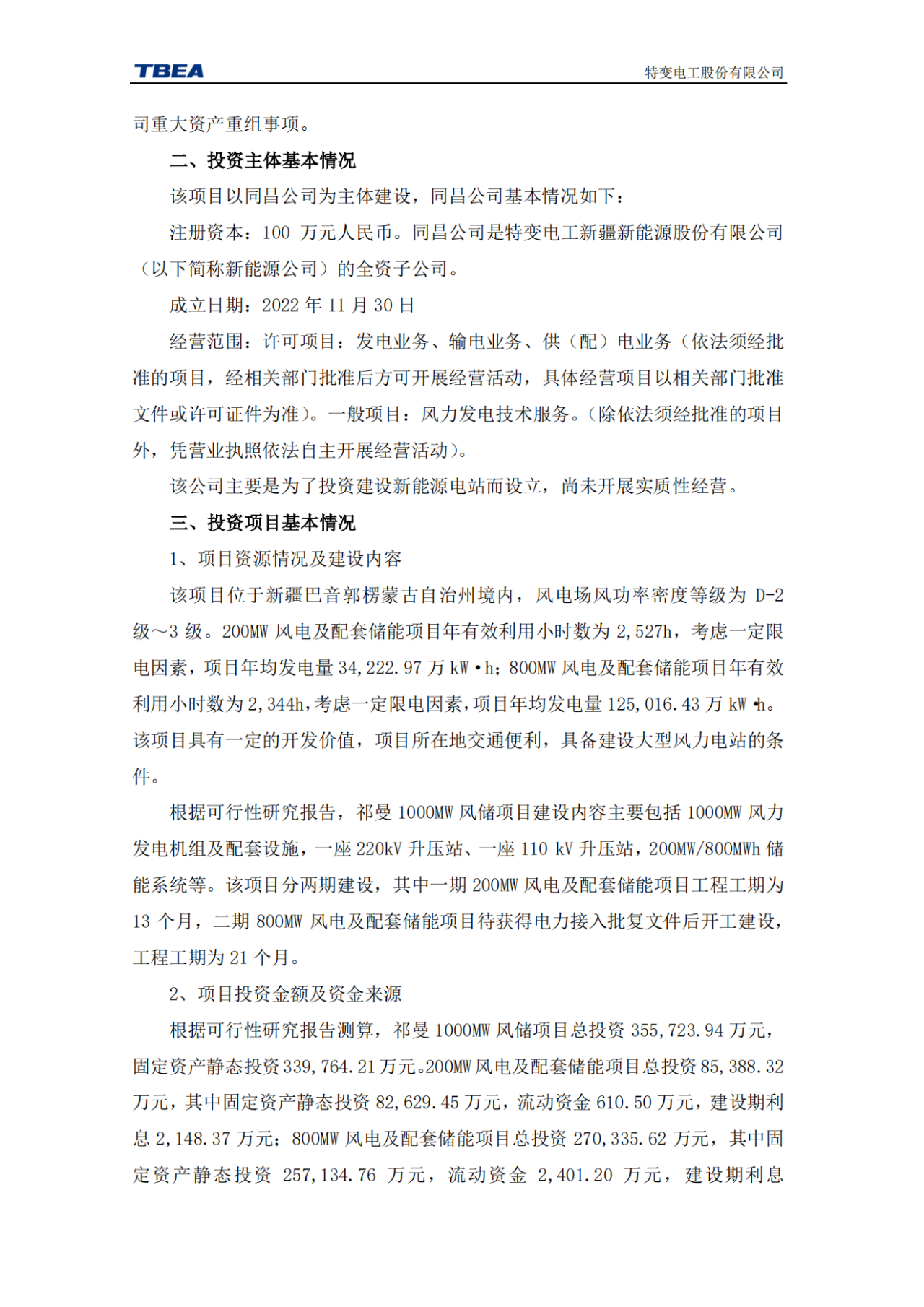 《公告》显示,特变电工控股公司若羌县同昌新能源有限公司投资建设巴州祁曼风区1000MW风电及配套储能项目,该项目分两期建设,其中一期建设200MW风电及配套储能项目,二期建设800MW风电及配套储能项目。祁曼1000MW风储项目总投资为355,723.94万元。