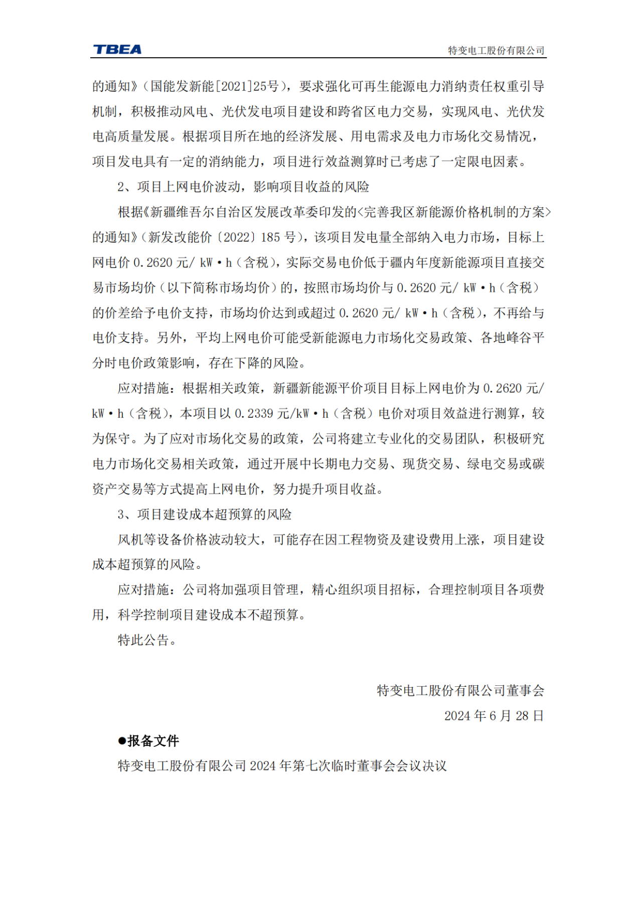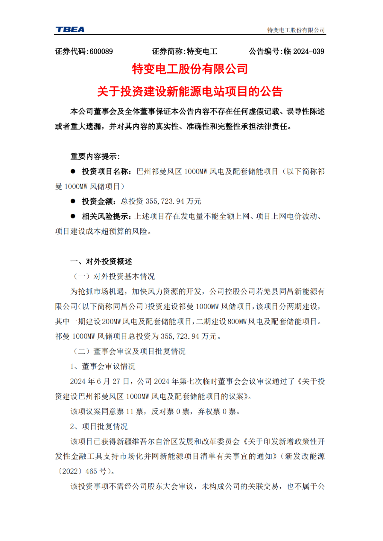 6月28日,特变电工发布《特变电工股份有限公司关于投资建设新能源电站项目的公告》。
