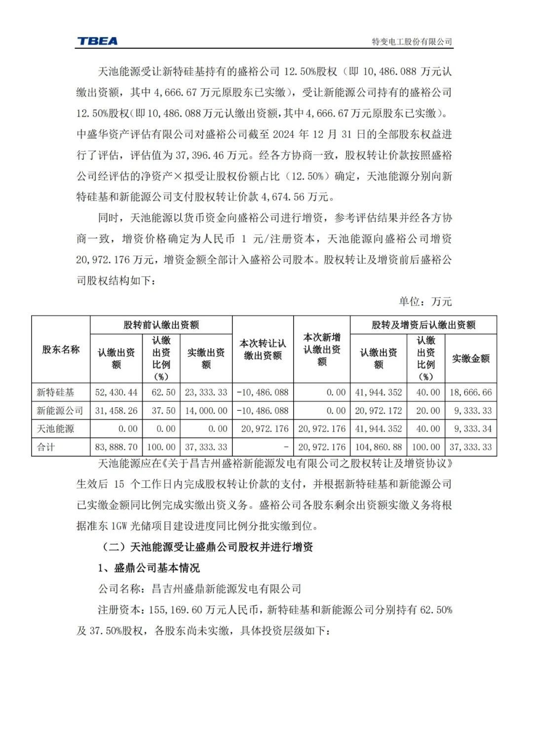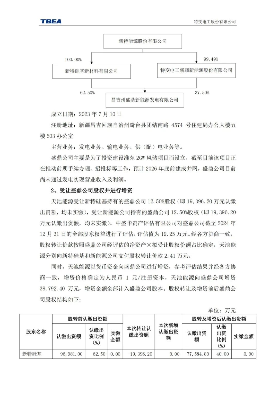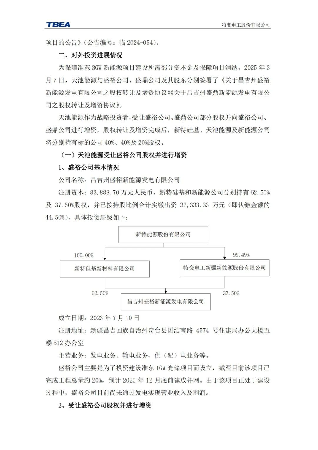 为解决准东1GW光储项目和准东2GW风储项目(以下统称准东3GW新能源项目)建设所需部分资本金及保障项目消纳,公司控股子公司新疆天池能源有限责任公司(简称天池能源)作为战略投资者受让盛裕公司及盛鼎公司(以下统称标的公司)部分股权并对标的公司进行增资。