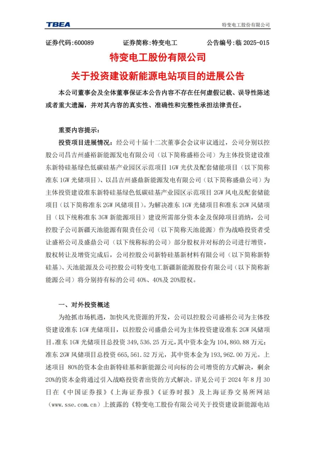 3月8日,特变电工股份有限公司发布关于投资建设新能源电站项目的进展公告。