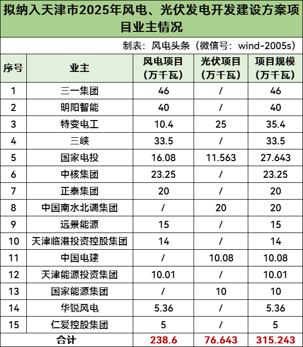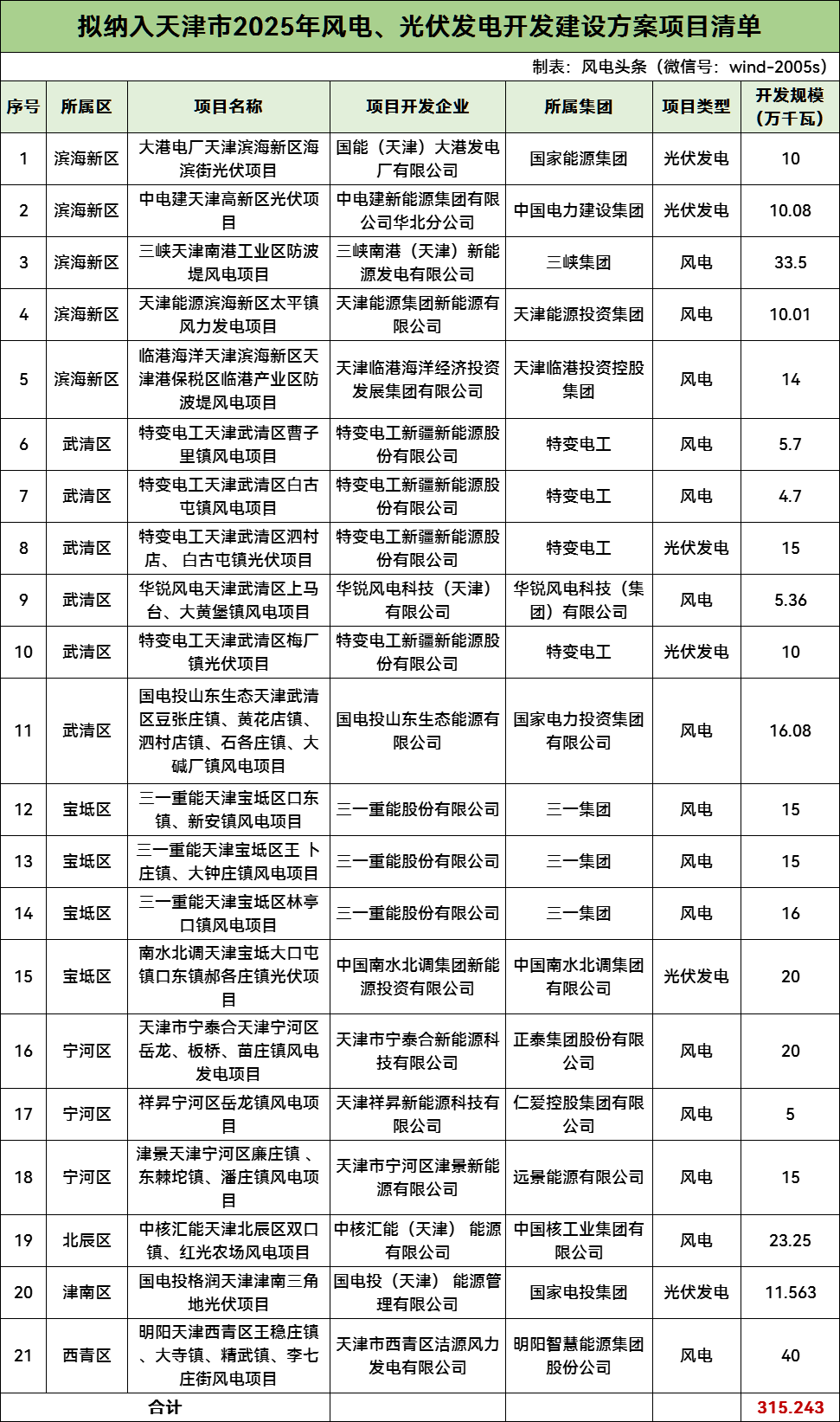 根据公示,拟纳入天津市2025年风电、光伏发电项目共21个,规模合计315.243万千瓦,其中,风电项目15个,规模合计238.6万千瓦;光伏项目6个,规模合计76.643万千瓦。