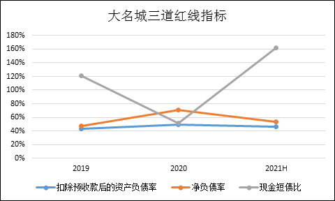 显然,在今年并无明显疫情影响的上半年,大名城的工程进度出了问题,这背后主要的原因可能与公司去年底账面现金不足的情况有关。减少拿地、加大回款、甚至减少结转,成为大名城竭力满足三道红线的无奈选择。