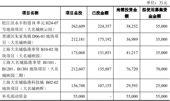 昨日,大名城发布了募集说明书(申报稿)(问询函回复更新版),公司本次向特定对象发行股票募集资金总额预计为不超过255,000万元(含本数),扣除发行费用后的募集资金净额将全部用于以下项目:松江区永丰街道H单元H24-07号地块项目(大名城映云间)、青浦区朱家角镇D06-01地块项目(大名城映湖)、上海大名城临港奉贤B10-02地块项目(大名城映园)、上海大名城临港奉贤B1101、B1201、B1301地块项目(大名城映园二期)、上海大名城临港科技城B02-02地块项目(大名城映晖)、补充流动资金。