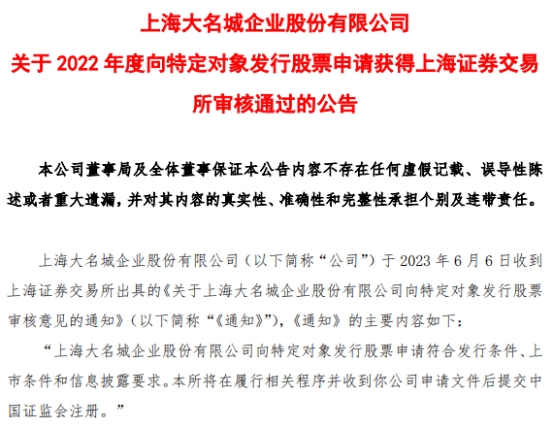 中国经济网北京6月7日讯大名城(600094.SH)昨日晚间发布公告称,公司于昨日收到上海证券交易所出具的《关于上海大名城企业股份有限公司向特定对象发行股票审核意见的通知》,公司向特定对象发行股票申请符合发行条件、上市条件和信息披露要求。上海证券交易所将在履行相关程序并收到公司申请文件后提交中国证监会注册。
