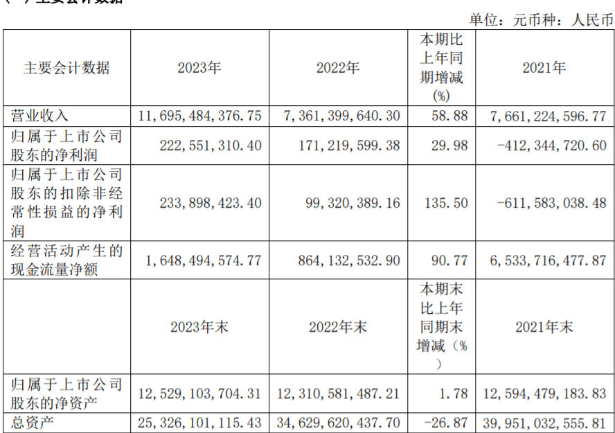 2023年,公司合并口径实现营业收入116.95亿元,同比增长58.88%,实现归属母公司所有者的净利润2.23亿元,同比增长29.98%,实现归属于母公司所有者的扣除非经常性损益后的净利润2.34亿元,同比增长135.50%。