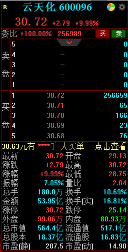 11月1日早盘,云天化高开高走,截至午间收盘,该股涨停,报30.72元,换手率10.69%,封单近26万手,市值564.4亿元。