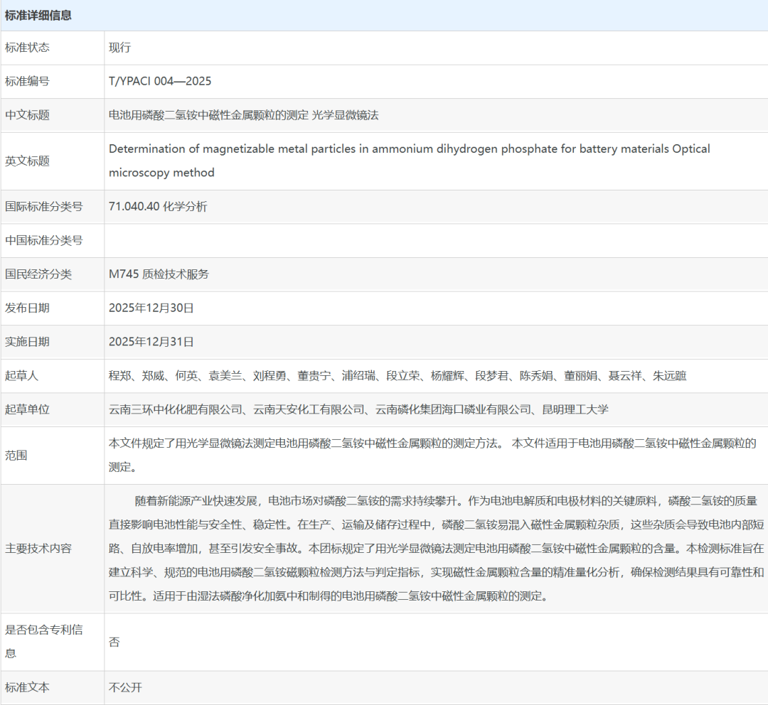 近日,由三环中化牵头,联合天安化工、海口磷业、昆明理工大学等单位起草的《电池用磷酸二氢铵中磁性金属颗粒的测定光学显微镜法》团体标准,在全国团体标准信息平台正式发布实施。这是三环中化首次主导制定并发布的团体标准,标志着其在电铵产品检测标准化领域实现重要突破,为新能源电池原料质量管控提供统一技术依据。