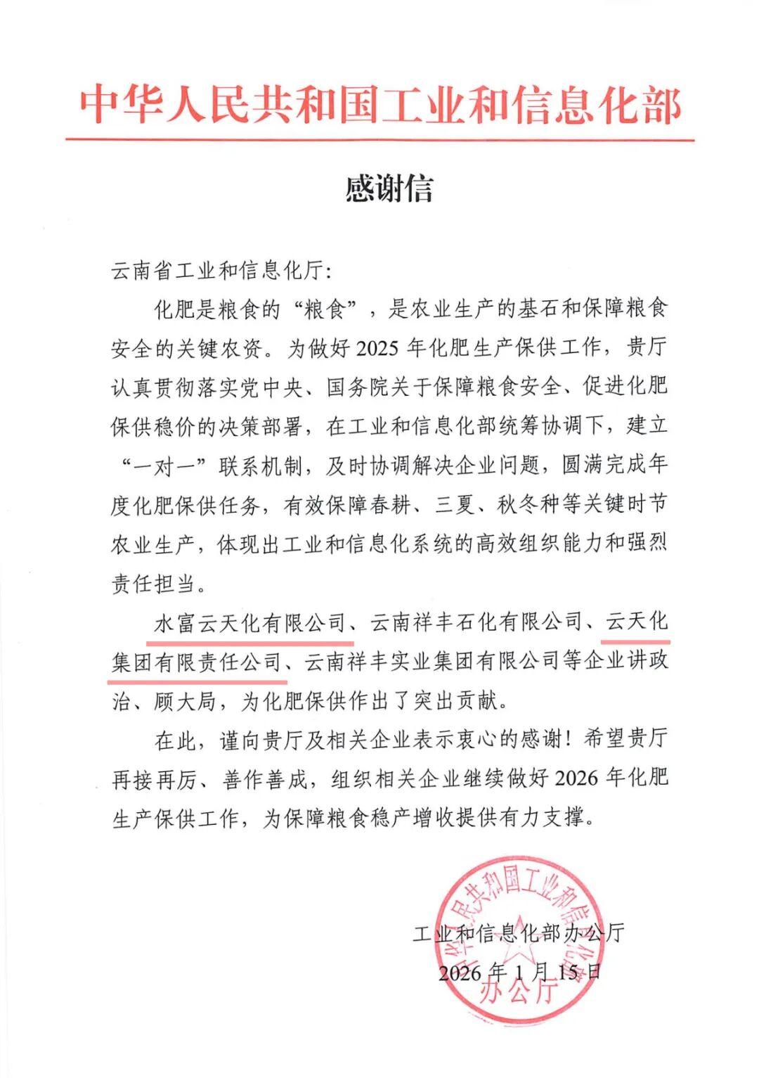 近日,工业和信息化部办公厅就2025年全国化肥保供方面作出突出贡献的企业发出感谢信。信中,云天化集团及所属单位讲政治、顾大局,以扎实有力的保供举措和优异的保供实绩被点名表扬。