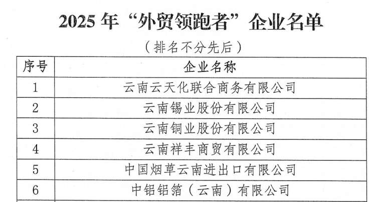 近日,云南省商务厅发布《关于认定2025年“外贸领跑者”企业的通知》,云天化联合商务凭借进出口规模、产业带动能力和合规经营表现,成功入选2025年云南省“外贸领跑者”企业名单。