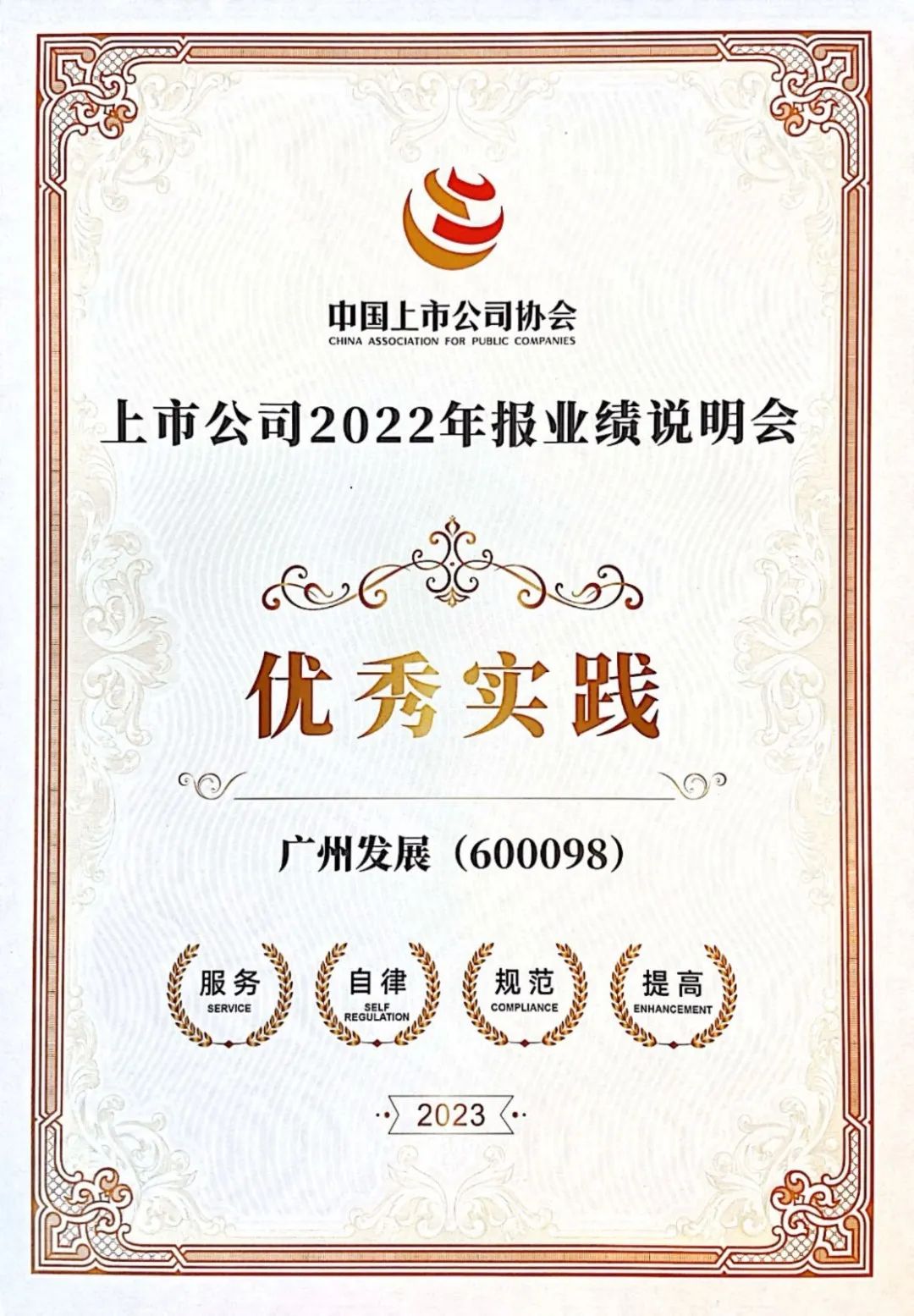 近日,在“2023中国上市公司发展论坛”上,中国上市公司协会隆重举办了“2022年报业绩说明会最佳及优秀实践”特别发布活动,广州发展集团在沪深北三市共计4510家召开2022年报业绩说明会的上市公司中脱颖而出,获颁“上市公司2022年报业绩说明会”优秀实践奖项。