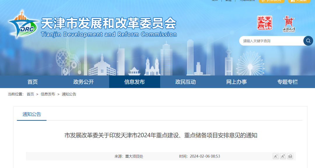 风芒能源获悉,2月6日,天津发改委发布《市发展改革委关于印发天津市2024年重点建设、重点储备项目安排意见的通知》。