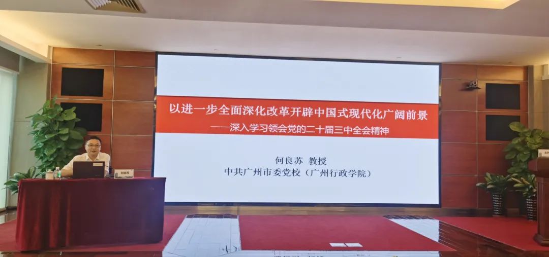 深学细悟习近平总书记在党的二十届三中全会上的重要讲话精神和全会精神,全力以赴推动总书记、党中央决策部署落地见效。广州市委党校党建部副主任何良苏教授为参训党员作“以进一步全面深化改革开辟中国式现代化广阔前景”的专题辅导,从全会的重大意义和深远影响,以及进一步全面深化改革的总体要求、重大举措、根本保证等方面深入解读,引领大家不断增强进一步全面深化改革,奋力推进中国式现代化的思想自觉、政治自觉和行动自觉。