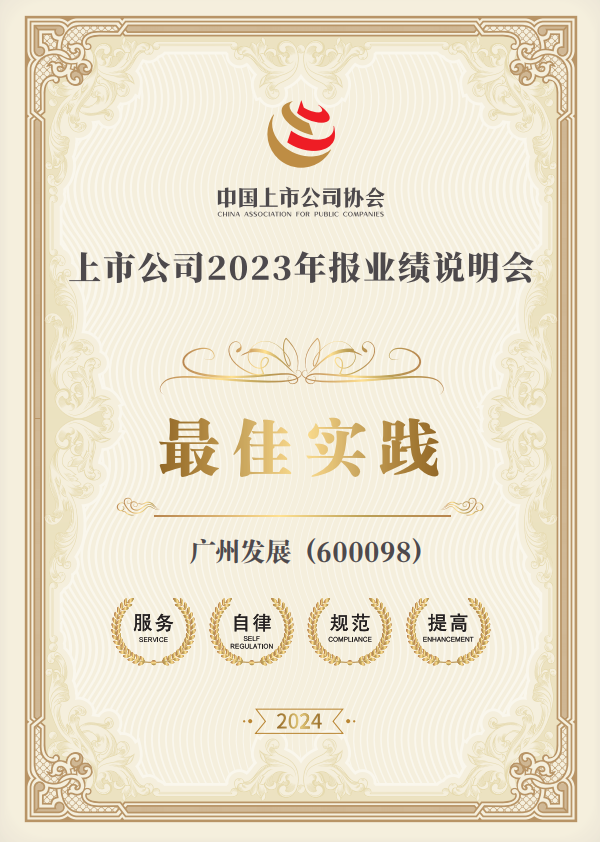 近日,中国上市公司协会发布“2023年报业绩说明会最佳及优秀实践”,广州发展集团凭借优秀的投资者关系管理和高质量业绩说明会荣获“上市公司2023年报业绩说明会最佳实践”。