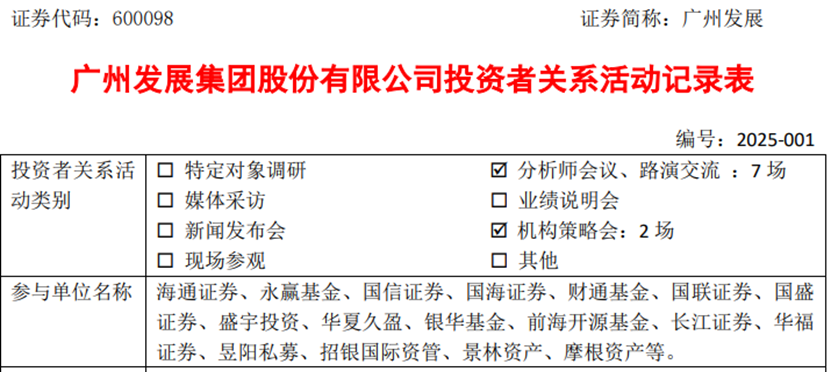 1月24日,上市公司广州发展(600098.SH)发布了《投资者关系活动记录表》,披露公司接待了海通证券、永赢基金、国信证券等数十家机构的现场调研,公司投资者关系部总经理姜云、财务部总经理张立更等管理层人士参与,并解答机构代表提问。