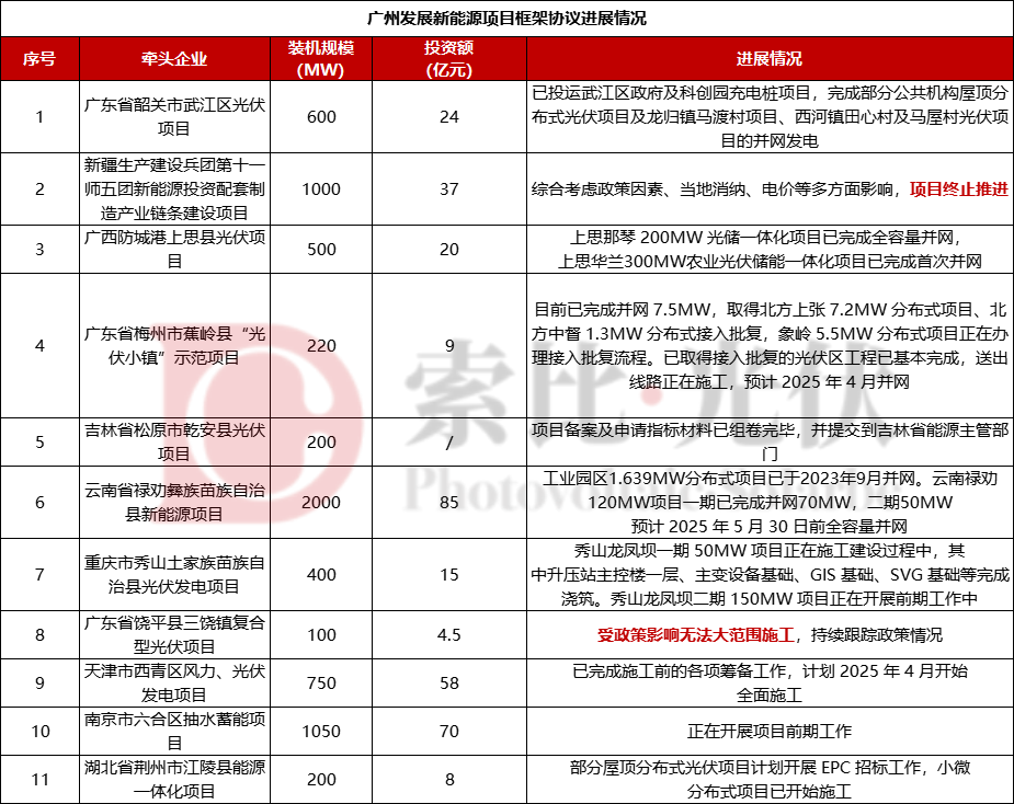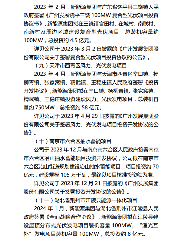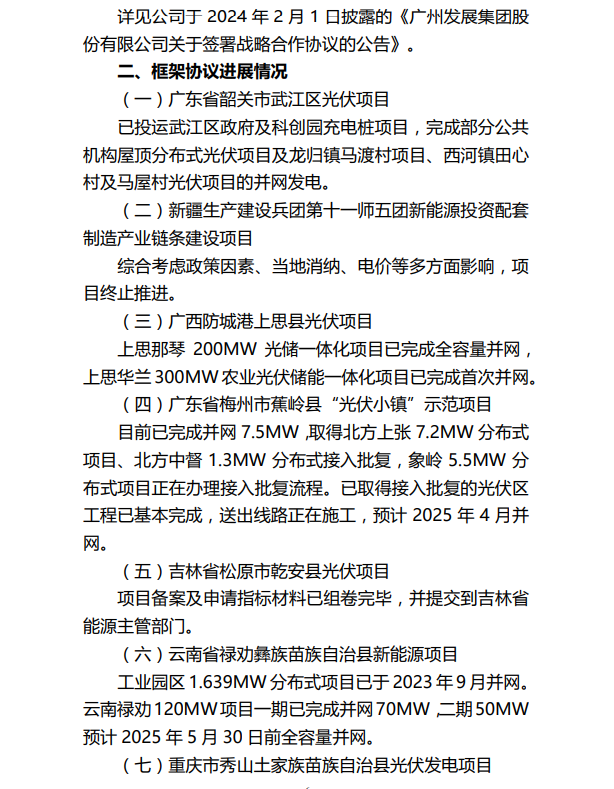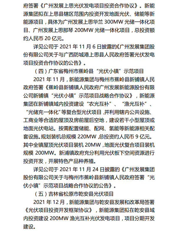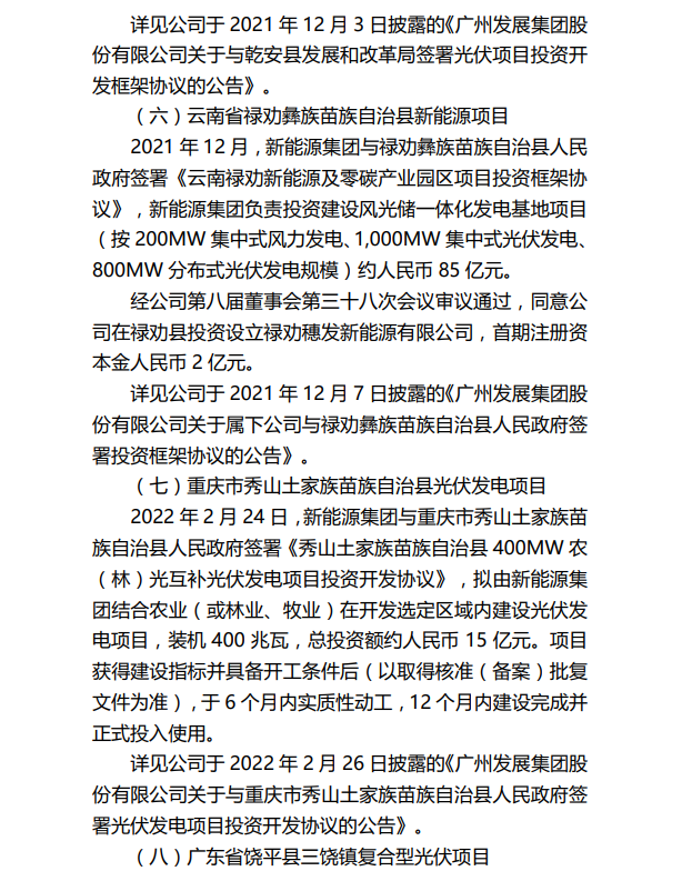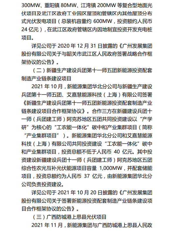 其中,新疆生产建设兵团第十一师五团新能源投资配套制造产业链条建设项目,因综合考虑政策因素、当地消纳、电价等多方面影响,项目终止推进。该项目拟投资建设新疆建设兵团十一师(兵团建工师)阿克苏地区五团综合性农光互补光伏能源项目容量 1,000MW,并配套储能项目,投资总额约为人民币 37 亿元,由广州发展新能源集团华北分公司负责投资建设。