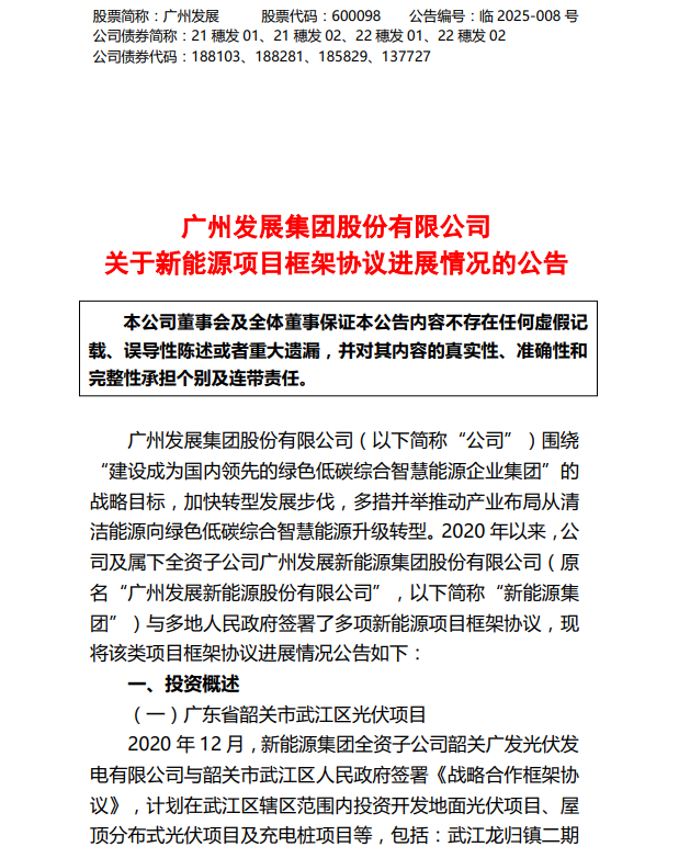 2月13日,广州发展发布广州发展集团股份有限公司关于新能源项目框架协议进展情况的公告。