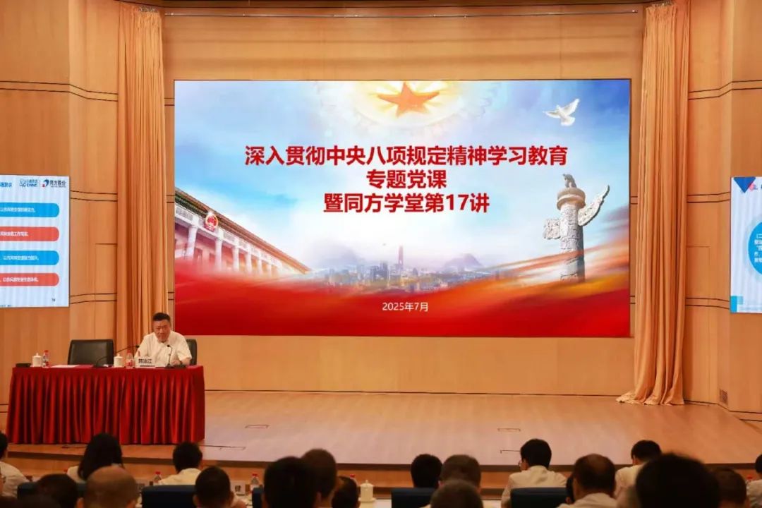 7月8日,同方股份党委书记、董事长韩泳江以《学深悟透强党性实干奉献树新风以作风建设新成效开创公司高质量发展新局面》为题讲授深入贯彻中央八项规定精神学习教育专题党课。公司党委副书记、总裁李成富主持学习。