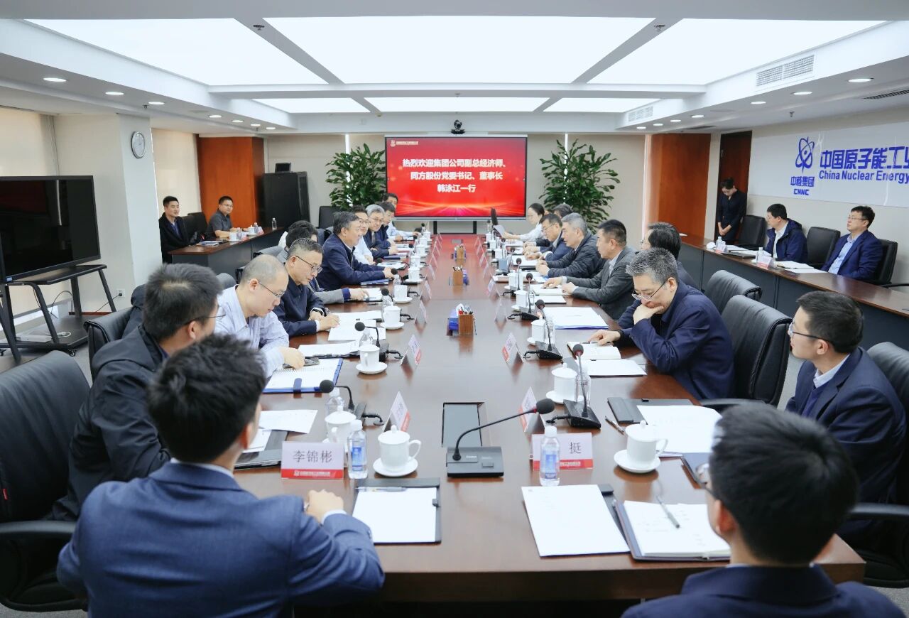 为贯彻落实中核集团“整体协同”的工作要求,以改革破局的决心和追求卓越的标准推动产业合作走深走实,加速推进数字原子能建设,3月20日,同方股份党委书记、董事长韩泳江一行赴中国原子能工业有限公司(以下简称“中国原子能”)拜访交流。中国原子能党委书记、董事长尤永春主持座谈交流,同方股份党委委员、副总裁张健、魏恒,中国原子能副总经理高海潮陪同会谈。