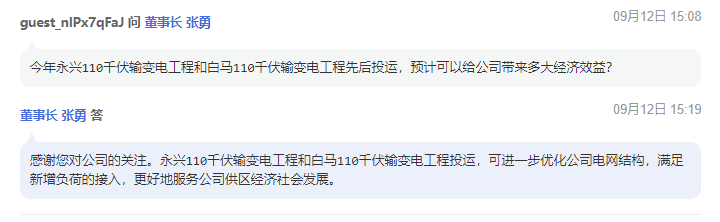 会上,张勇作开场致辞,代表公司董事会对广大投资者的关注与支持表示了感谢,同时介绍了公司2023年半年度经营情况、财务表现及发展战略等。在互动交流环节,投资者聚焦公司经营目标、电价改革、主营业务、现金分红、市值管理、矿产开发、新能源业务等方面提问,60分钟内累计收到线上问题16条,创下历史新高,投资者参会热情与体验感持续增强。面对投资者提问,公司有问必答,坦诚回应,回复率保持100%,让投资者充分了解公司的发展思路和经营理念,传递了管理层建设“现代一流明星电网、现代一流明星公司”发展目标的决心和底气。
