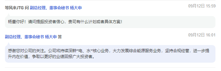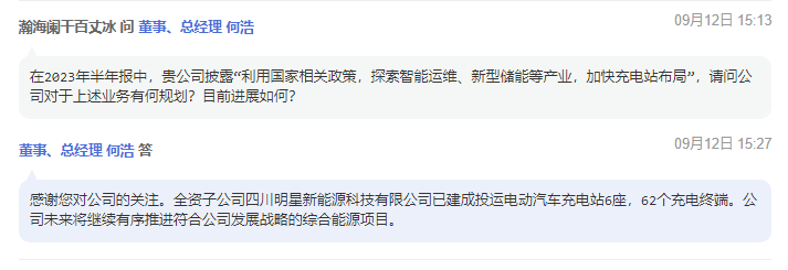 9月12日下午,明星电力公司召开2023年半年度业绩说明会,旨在帮助广大投资者进一步解读公司半年度报告,全方位、深层次了解公司生产经营发展状况。会议通过网络平台与投资者进行互动交流,公司董事长、党委书记张勇,董事、总经理何浩,独立董事唐国琼,财务总监邹德成,副总经理、董事会秘书杨大申出席并回答提问。