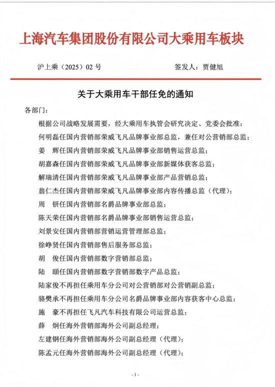 2月19日据华尔街见闻报道,上汽大乘用车板块发生大规模干部任免,涉及超过60位中高层管理人员。此次任免由上汽集团总裁贾建旭签发,并于2月12日生效。文件截图显示,任免涉及荣威、名爵、飞凡等核心品牌,同时研发、营销、产品等部门也被纳入重组范围。