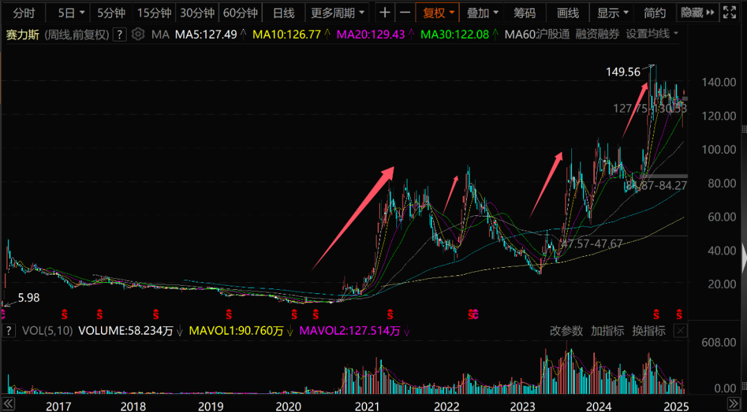 2020年,赛力斯大涨52%;2021年,赛力斯暴涨253%;2022年在股市整体大幅下行情况下,下跌33%;2023年重拾涨势,大涨91%;2024年,再度大涨76%。