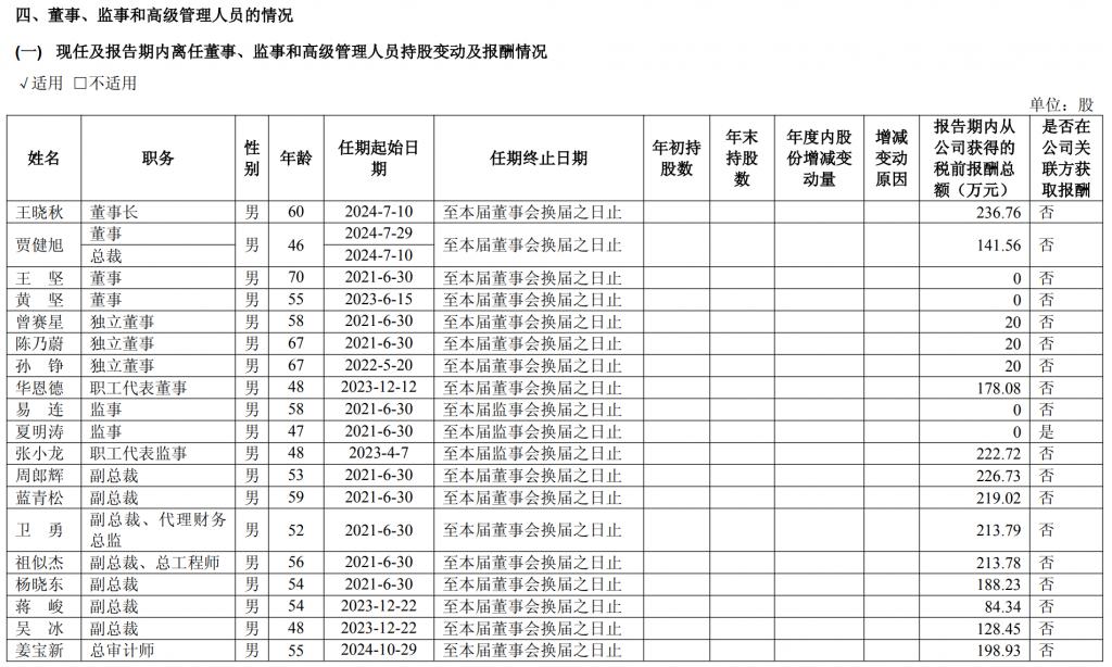 除董事长王晓秋年薪达 200 万元以上,包括副总裁周郎辉、职工代表监事张小龙、副总裁蓝青松、副总裁/代理财务总监卫勇、副总裁/总工程师祖似杰五位高管薪酬也达到 200 万元级别,分别为 226.73 万元、222.72 万元、219.02 万元、213.79 万元、213.78 万元。此外,董事/总裁贾健旭薪酬为 141.56 万元;而已退休的陈虹薪酬为 175.91 万。