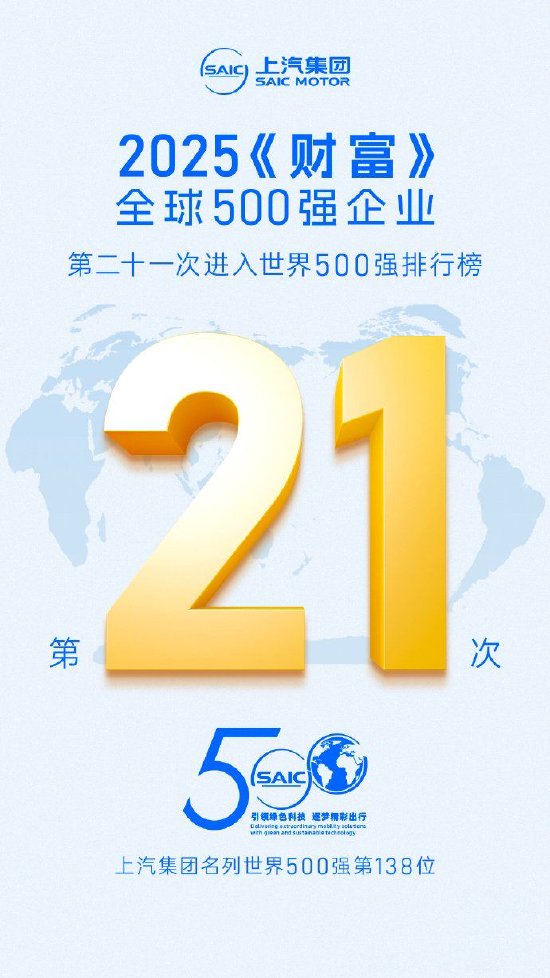 《财富》杂志于北京时间7月29日公布了2025年世界500强排行榜。上汽集团以2024年度合并报表872.239亿美元的营业收入名列世界500强第138位,第二十一次进入世界500强排行榜。
