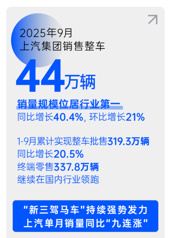 10月8日,上汽集团发布产销快报。9月份,上汽集团销售整车44万辆,销量规模位居行业第一,同比增长40.4%,环比增长21%。