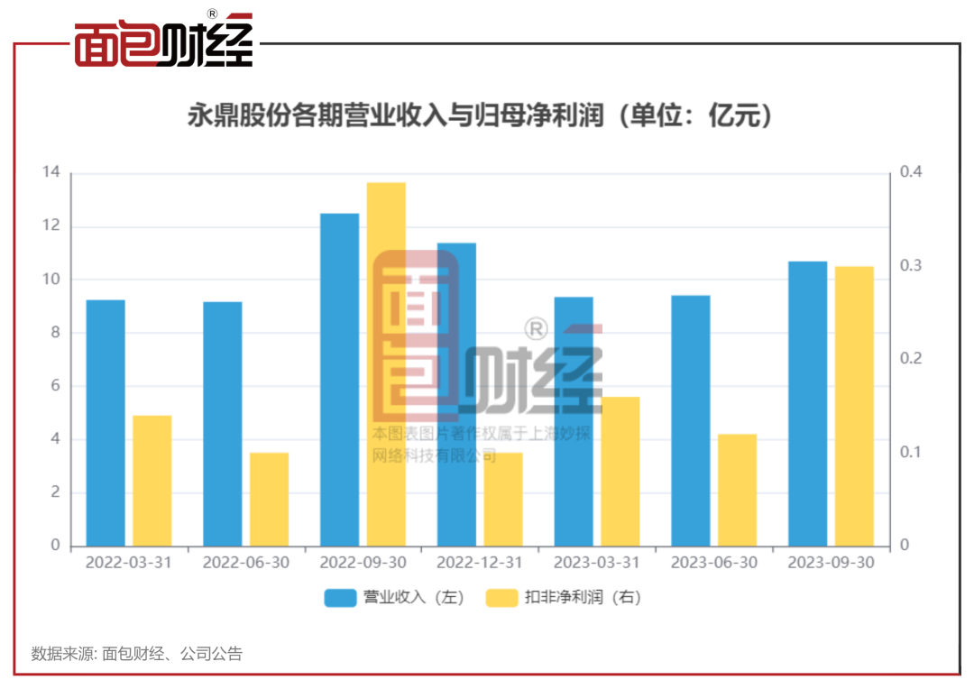 三季报显示,2023年第三季度永鼎股份归母净利润下滑较为明显。报告期内,永鼎股份实现营收10.69亿元,同比下降14.37%;扣非归母净利润0.30亿元,同比减少24.09%。