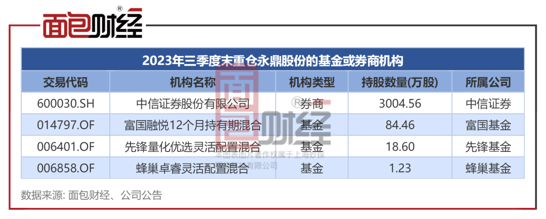 公开资料显示,2023年三季度末有多家基金或券商机构重仓持股永鼎股份,剔除指数型产品,重仓永鼎股份的机构有中信证券、富国基金、先锋基金等。