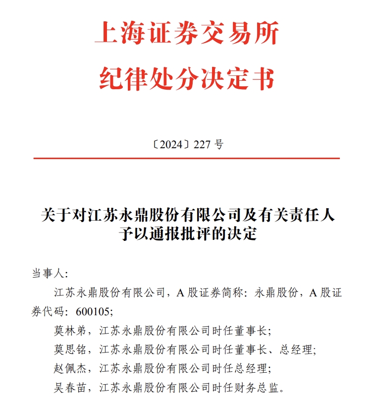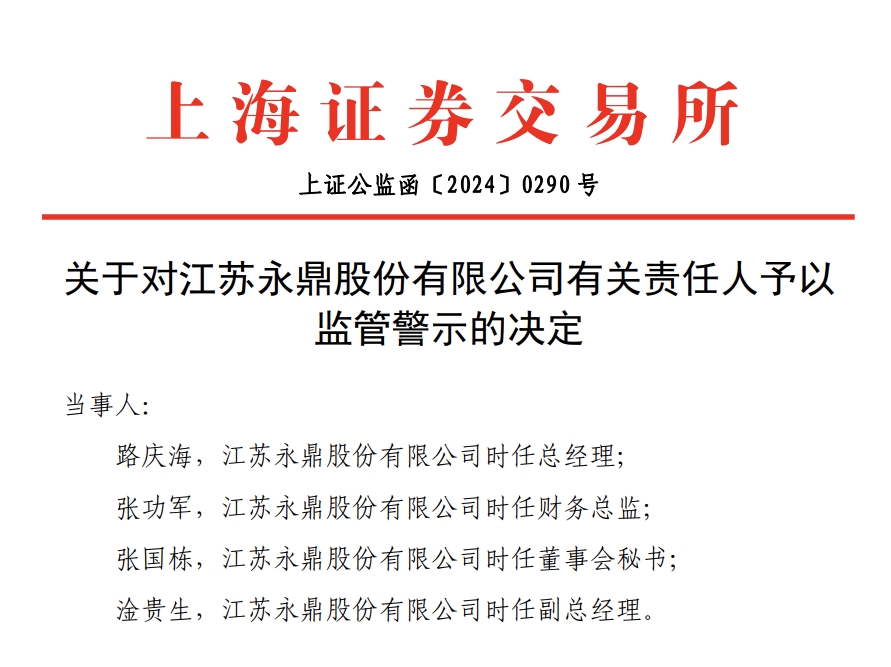 12月17日,上交所披露了两份与永鼎股份及相关负责人有关的监管函件。其中一份是对永鼎股份及时任董事长莫林弟,时任董事长、总经理莫思铭,时任总经理赵佩杰,时任财务总监吴春苗予以通报批评,另一份是对永鼎股份时任总经理路庆海、时任财务总监张功军、时任董事会秘书张国栋、时任副总经理淦贵生予以监管警示。