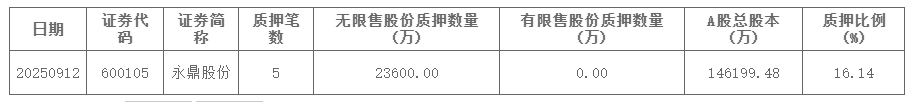 中登公司官网最新数据显示,截至2025年9月12日,永鼎股份的股份质押比例为16.14%。