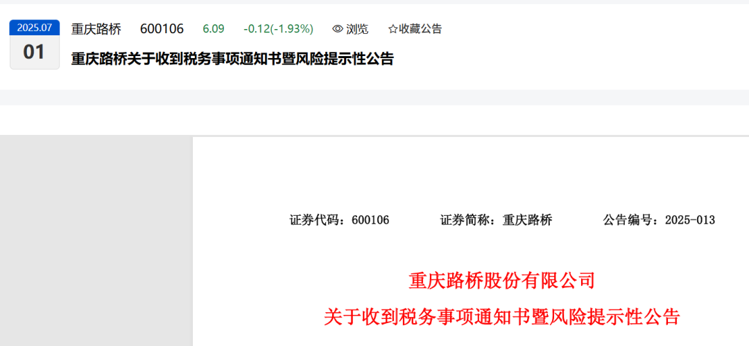 近日,重庆路桥股份有限公司(以下简称“公司”)收到国家税务总局重庆市渝中区税务局《税务事项通知书》(渝中税通〔2025〕26243 号),现将有关情况公告如下: