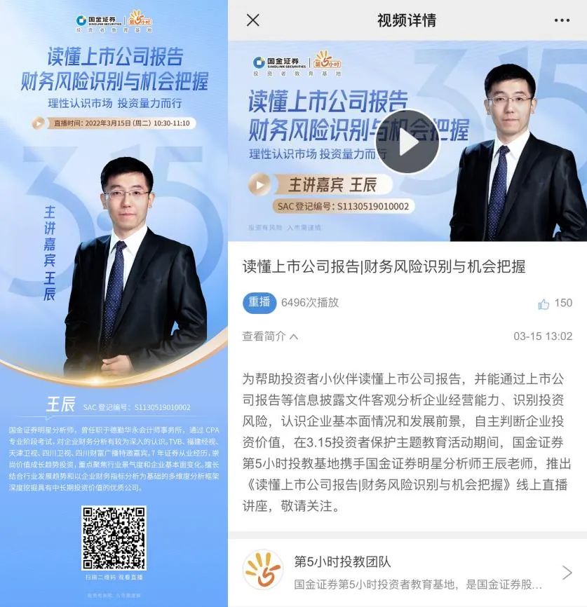 为帮助投资者读懂上市公司报告,并能通过上市公司报告等信息披露文件客观分析企业经营能力、识别投资风险,认识企业基本面情况和发展前景,自主判断企业投资价值,在3.15投资者保护主题教育活动期间,基地携手国金证券明星分析师王辰老师于2022年3月15日10点30分推出《读懂上市公司报告|财务风险识别与机会把握》线上直播讲座。