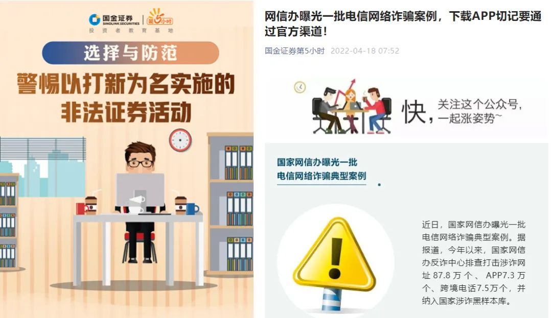 4、为宣传揭露非法活动犯罪手法和主要特点,提高投资者风险识别和防范能力,公司将防非知识转化为趣味图文,并通过基地各平台持续进行防非活动宣传。