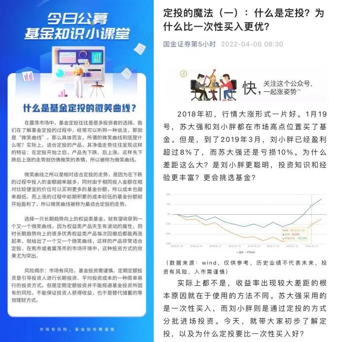 1、为提醒投资者高度重视和认真评估投资风险,远离非法证券咨询活动,理性参与证券投资,公司通过基地发布《基金知识小课堂》《定投的魔法》等系列原创图文,不断拓展投教的覆盖面,让更多投资者具备基本的金融素养,培养理性投资理念。