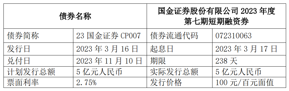债券简称为“23国金证券CP007”,发行日为2023年3月16日,起息日为2023年3月17日,兑付日2023年11月10日,期限共计238天。“23国金证券CP007”实际发行总额为5亿元人民币,发行价格100元/百元面值,票面利率2.75%。