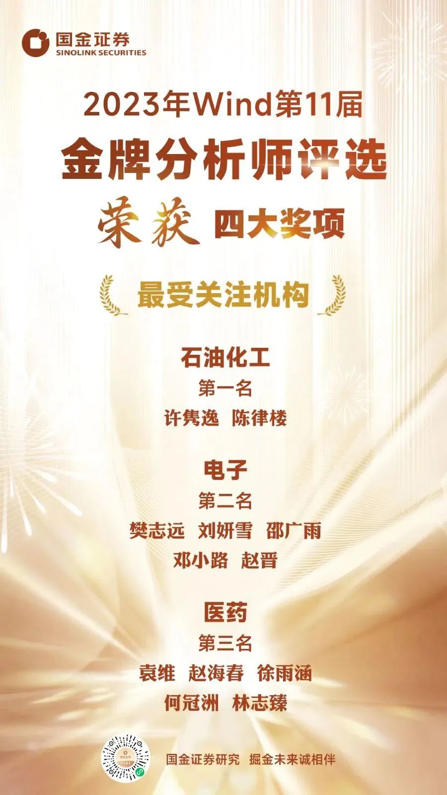 11月20日,2023年第十一届Wind“金牌分析师”评选结果正式揭晓。本次评选共设立32个研究领域单项奖及3个机构奖项。其中国金证券荣获“最受关注机构”奖、“研究领域单项”奖:石油石化第一名、电子第二名、医药第三名。