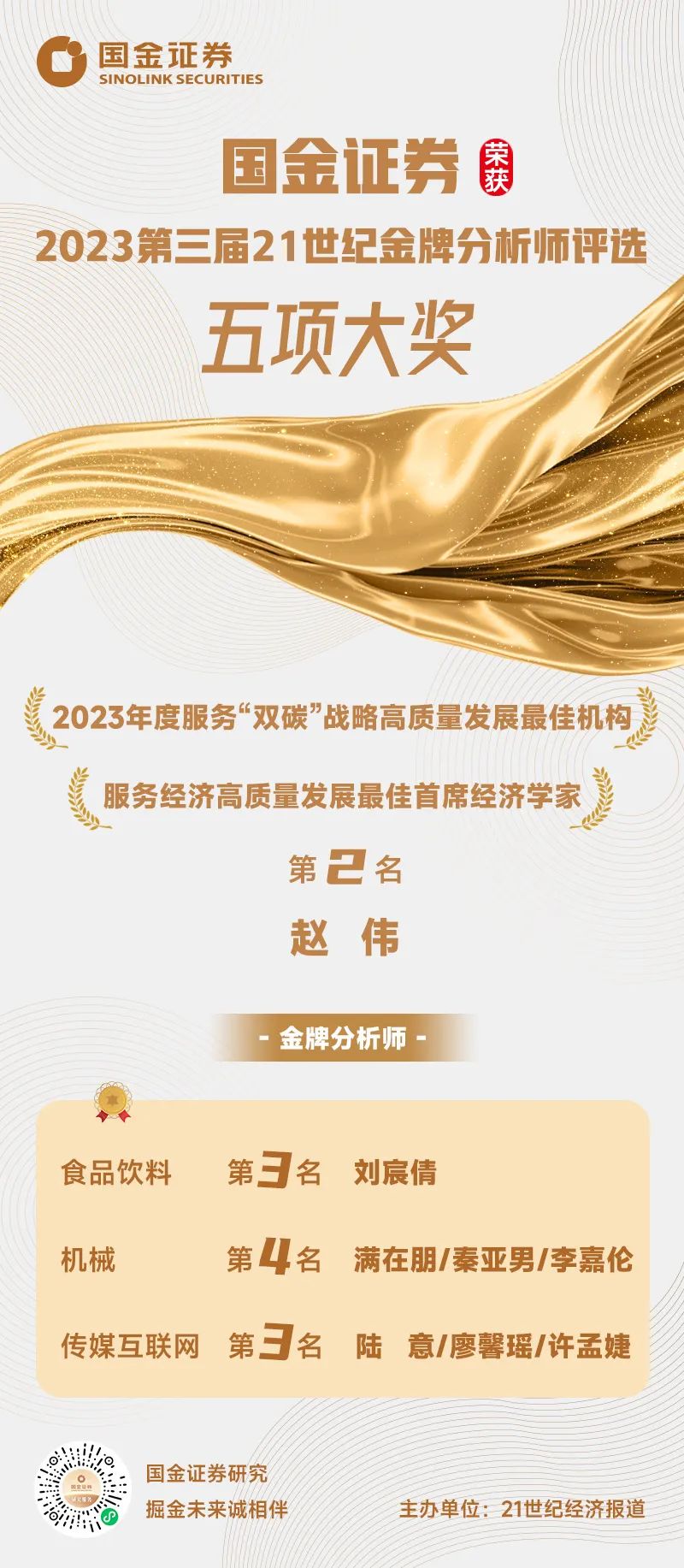 12月6日,由21世纪经济报道主办的第三届21世纪金牌分析师评选榜单正式出炉。国金证券荣获2023年度服务“双碳”战略高质量发展最佳机构,服务经济高质量发展最佳首席经济学家第二名:赵伟,金牌分析师奖项中,食品饮料第三名:刘宸倩,机械类第四名:满在朋秦亚男李嘉伦,传媒互联网第3名:陆意廖馨瑶许孟婕。