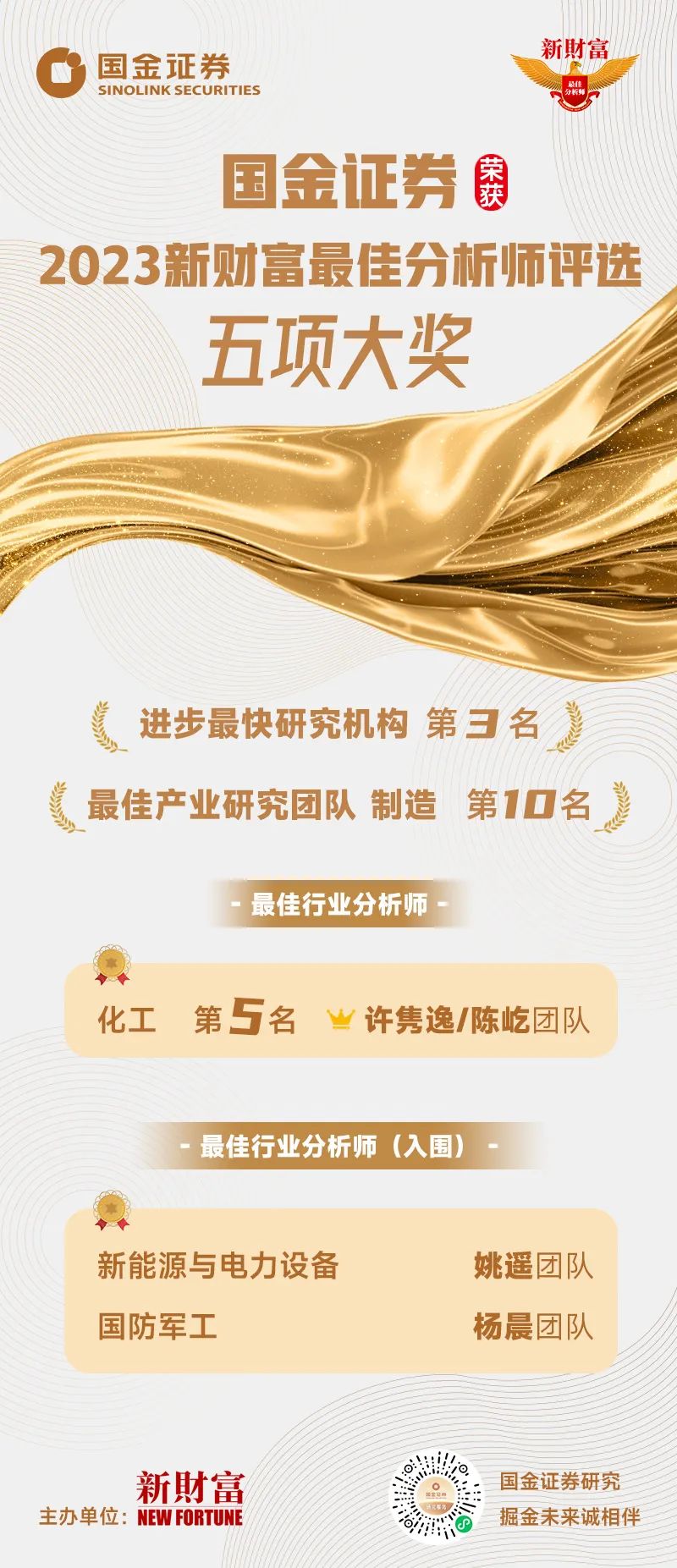 12月5日,2023年第二十一届新财富最佳分析师颁奖典礼隆重举行,国金证券荣获“进步最快研究机构”奖第3名,“最佳产业研究团队(制造)”第10名,化工行业“最佳分析师”奖第5名,新能源与电力设备,国防军工分别获得“最佳分析师”奖入围奖。