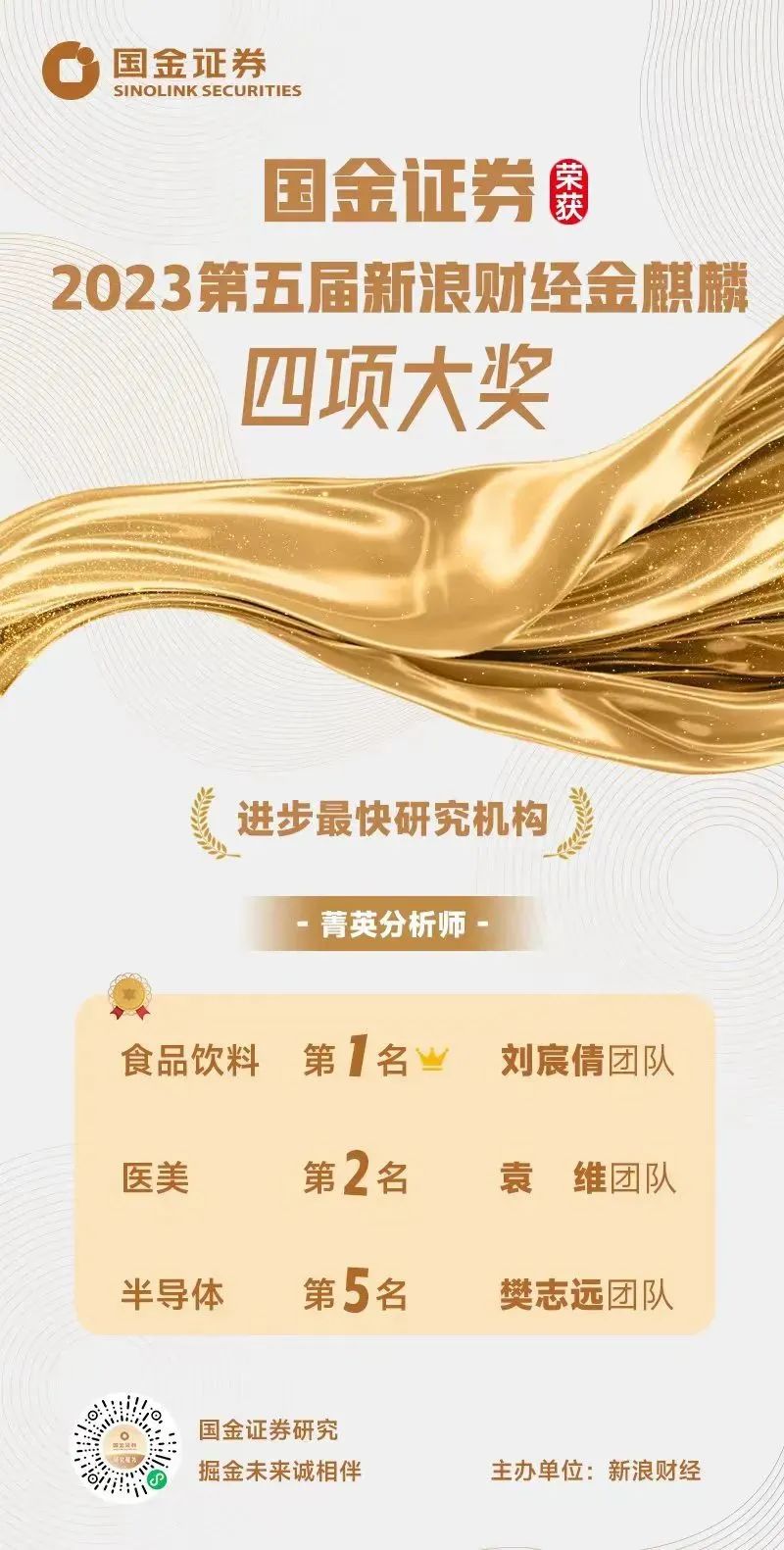 11月24日,由新浪财经主办的“2023分析师大会暨第五届新浪财经金麒麟最佳分析师颁奖盛典”在上海举行。大会上,最佳分析师榜单也正式出炉。国金证券荣获“进步最快研究机构”奖、“菁英分析师”奖:食品饮料第一名刘宸倩团队;医美行业第二名袁维团队;半导体第五名樊志远团队。