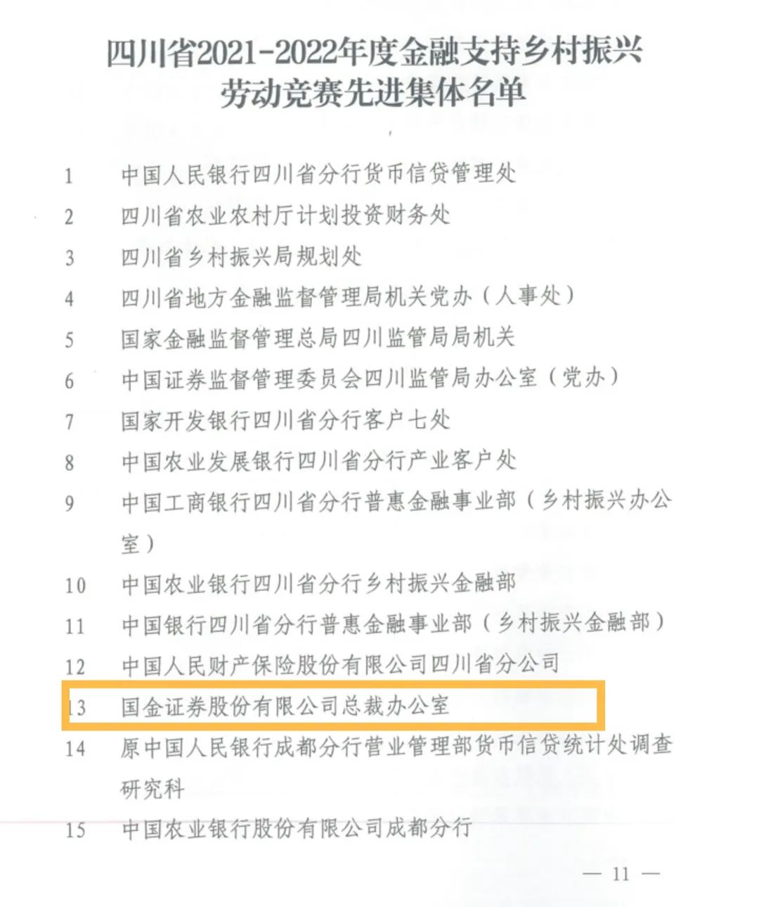 日前,四川省“凝聚金融力量、助力乡村振兴”金融支持乡村振兴劳动竞赛结果出炉,国金证券股份有限公司总裁办公室获“四川省2021-2022年度金融支持乡村振兴劳动竞赛先进集体”荣誉。