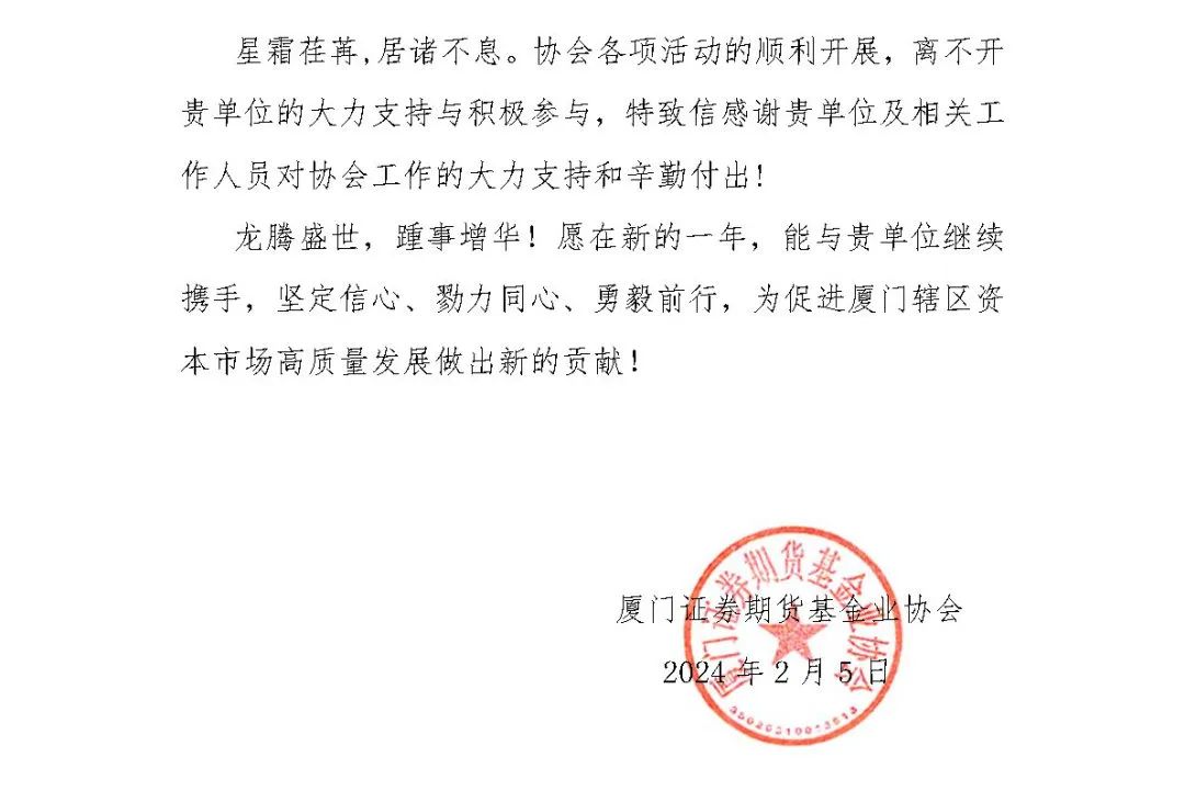 厦门证券期货基金业协会在感谢中指出,过去的一年,在厦门证监局以及中国证券业协会、中国期货业协会、中国证券投资基金业协会、中证资本市场法律服务中心的指导下,厦门证券期货基金业协会坚持以习近平新时代中国特色社会主义思想为指导,积极贯彻落实党的二十大精神,紧紧围绕“自律、服务、传导”的职能定位,不断加强党建引领,强化自律管理,凝聚辖区行业力量,持续抓好行业党建、深化投资者教育与保护、推进行业文化建设、多元开展政策解读与业务培训、加强同业交流协作、促进项目投融资对接、推动校企合作、助力乡村振兴、稳妥化解金融纠纷等工作,有效促进了行业交融与创新发展,扎实提升行业机构服务实体经济的能力水平。