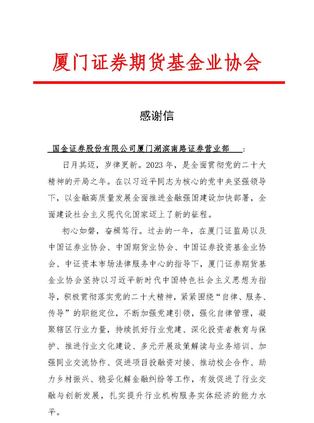 日前,厦门证券期货基金业协会向国金证券厦门湖滨南路证券营业部发来感谢信,感谢湖滨南路营业部对于协会工作的大力支持和辛勤付出。