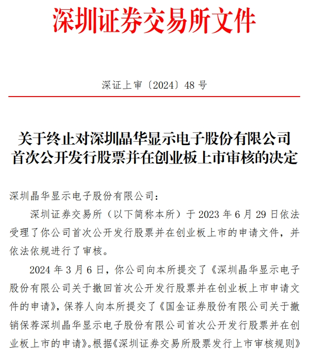 3月12日披露公告显示,晶华电子及保荐人国金证券申请撤回上市申请文件。